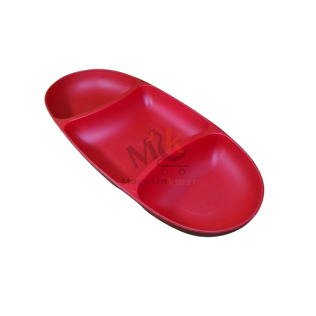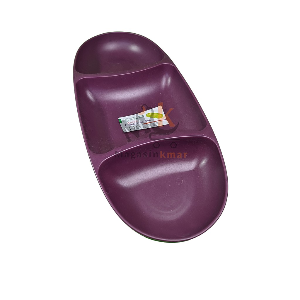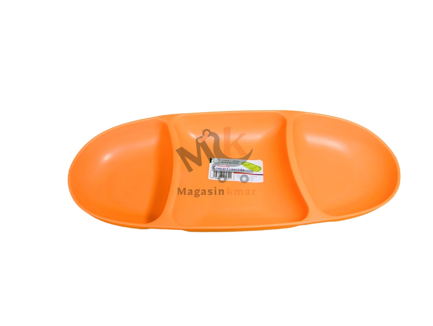 Cette assiette en plastique alimentaire à trois compartiments de forme ovale possède un design moderne et lumineux ainsi qu'une paroi profonde pour un ramassage facile.