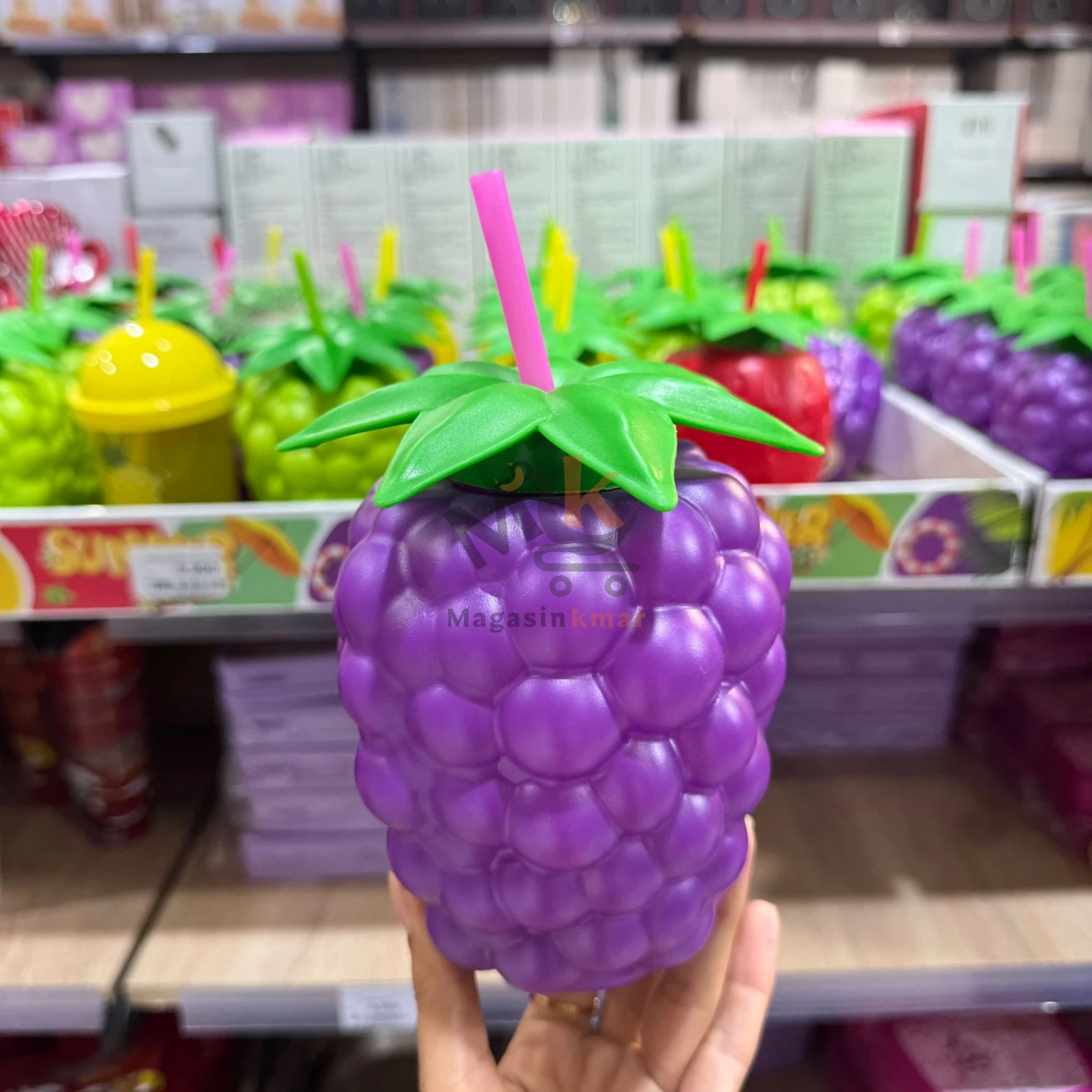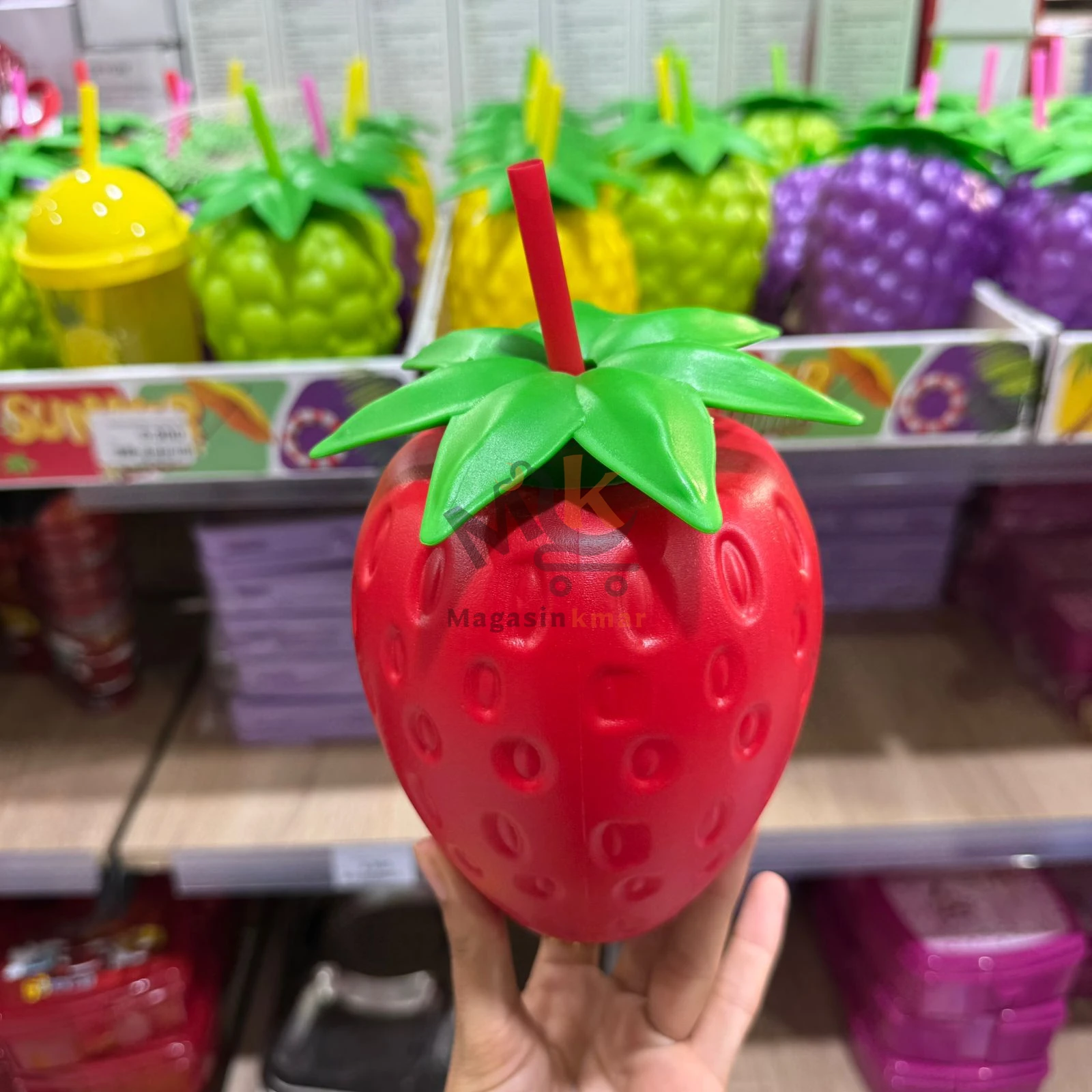 Chope en plastique avec paille intégrée, au design ludique en forme de légumes, parfaite pour les boissons fraîches lors des fêtes et repas en famille.