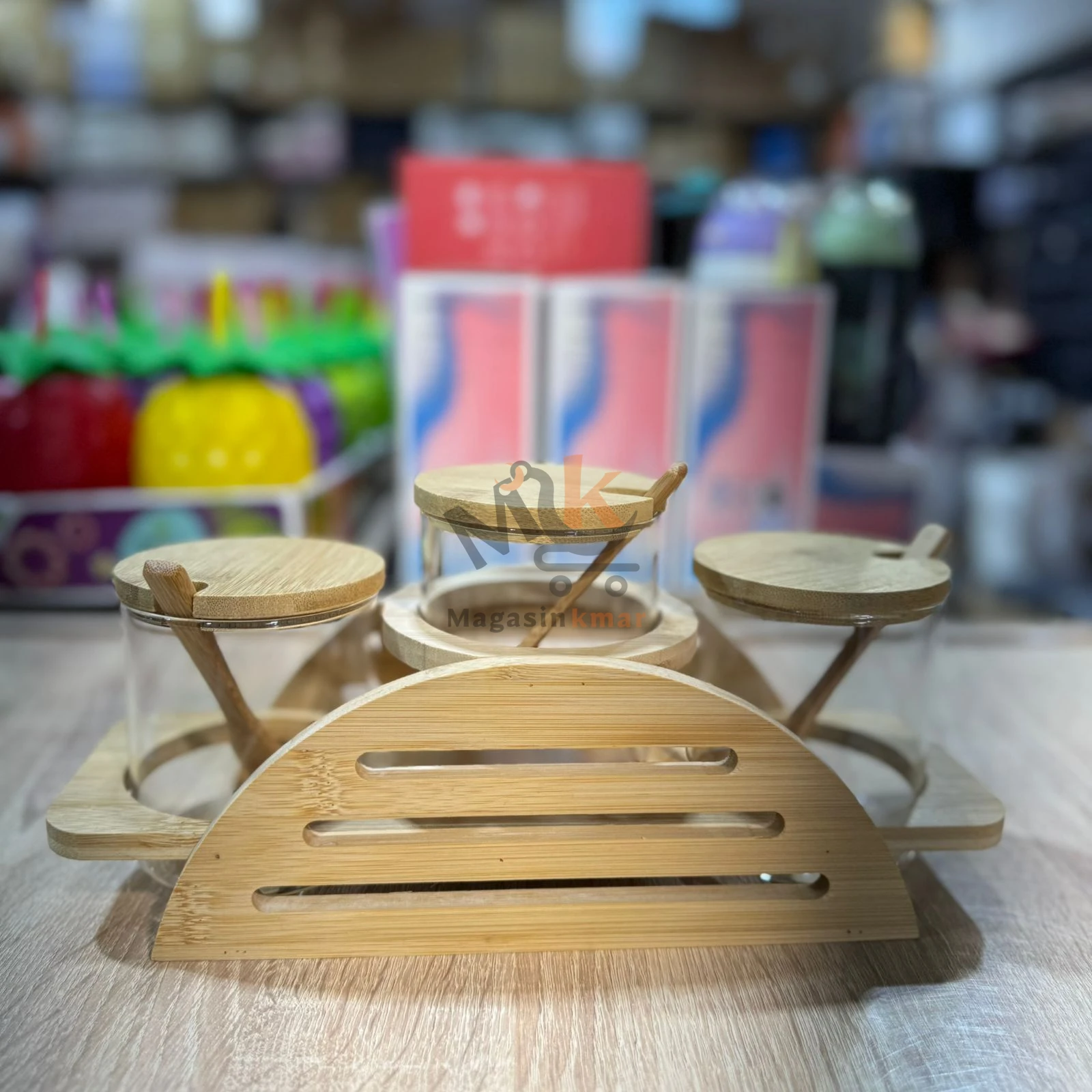 Porte-épices Rond en verre avec support et couvercle en bambou
