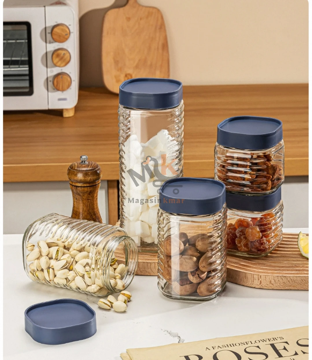 Organisez vos épices, céréales ou légumineuses avec ce set de 5 bocaux en verre, idéal pour une cuisine bien rangée et esthétique.