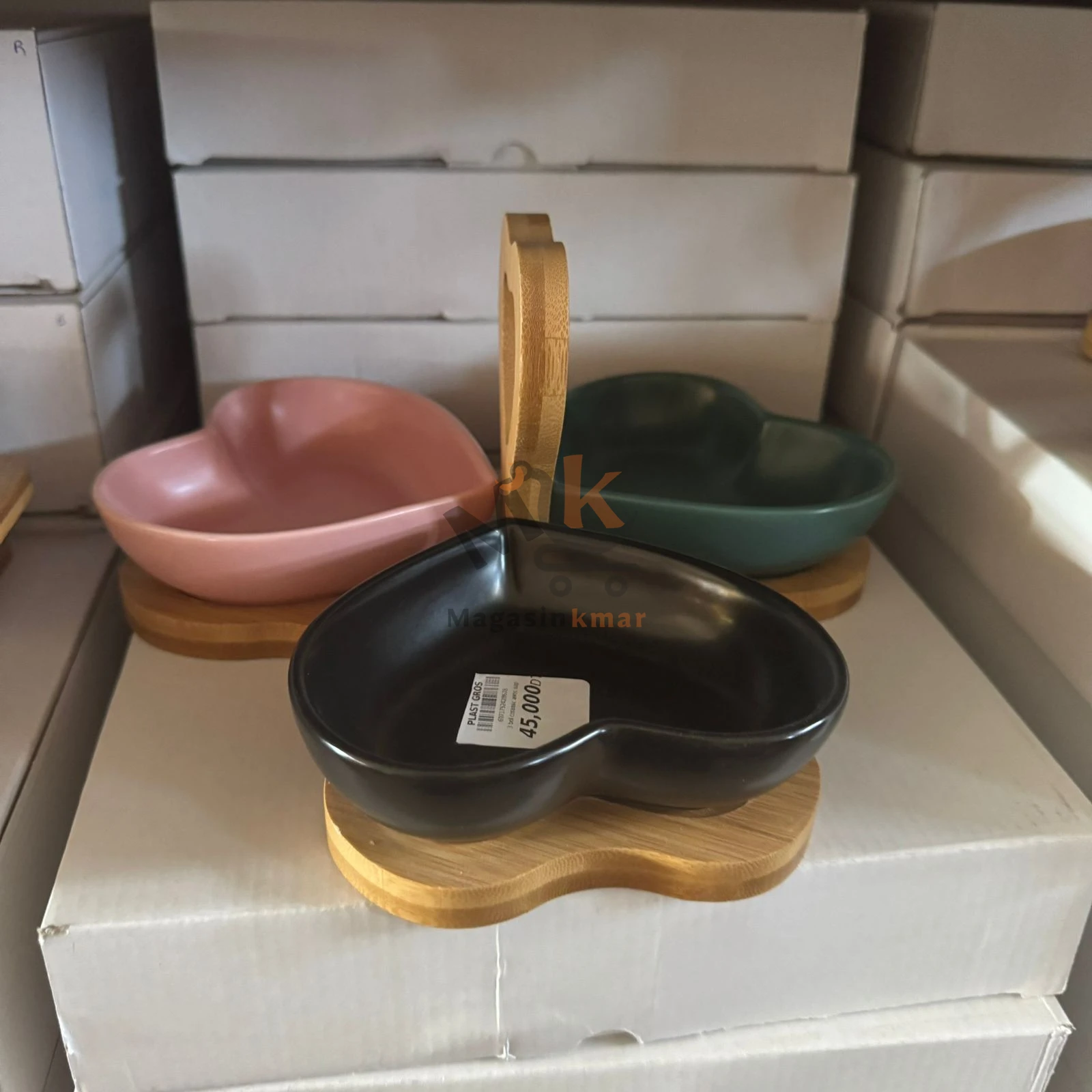 Ensemble de 3 bols forme cœur en céramique avec support en bois – Service élégant