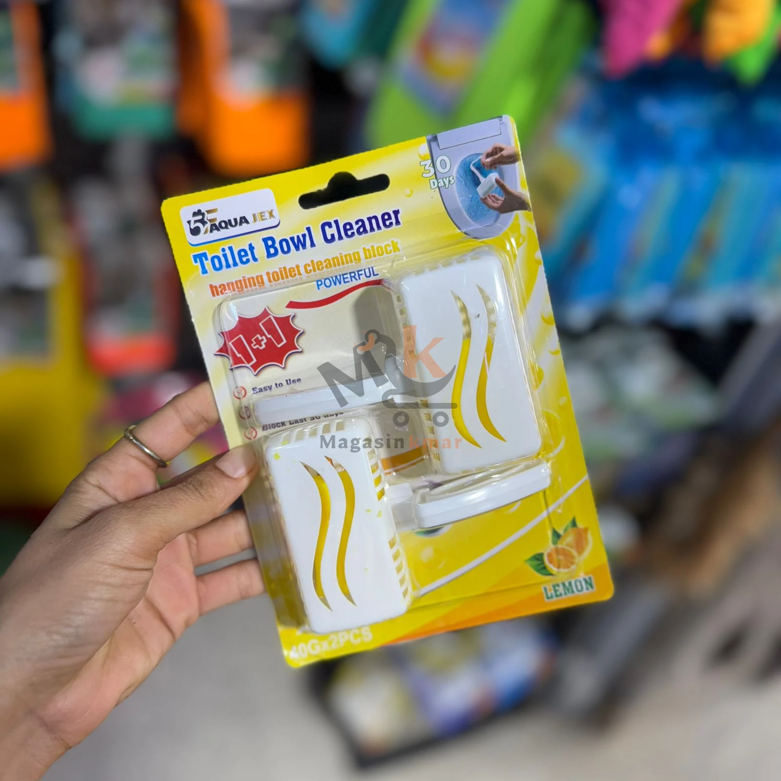 Lot de 2 blocs WC aqua de 40g, idéal pour nettoyer et parfumer vos toilettes tout en éliminant les mauvaises odeurs à chaque chasse d’eau.
