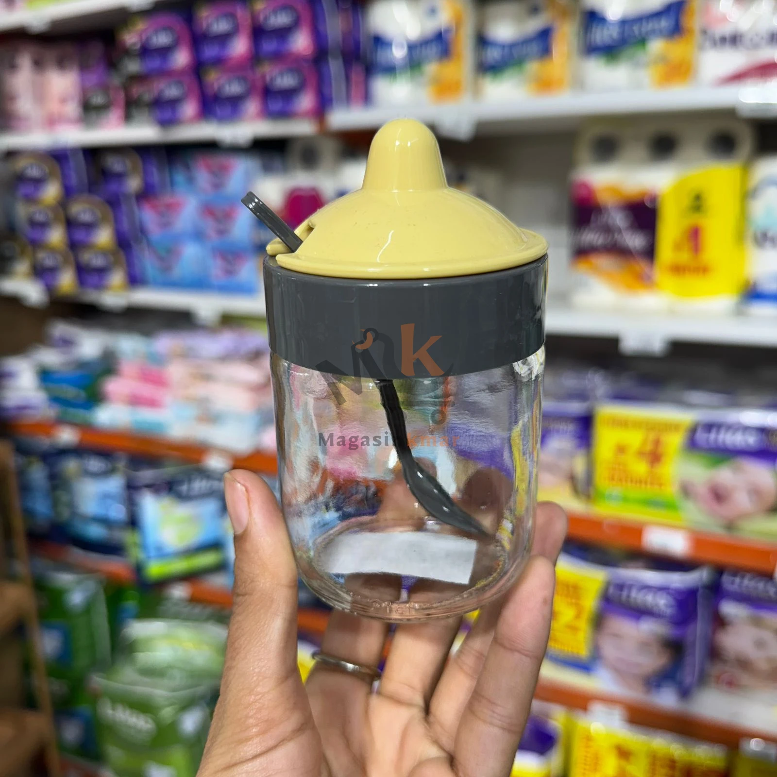 Boîte à épices en verre avec cuillère et couvercle en plastique