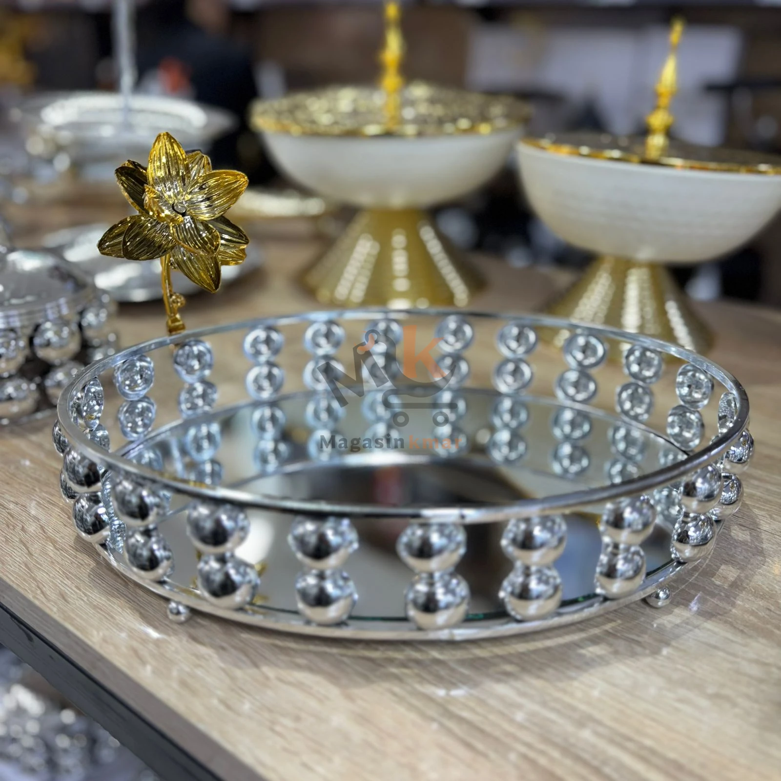 Plateau ovale en métal argent avec motif doré – Élégant pour service
